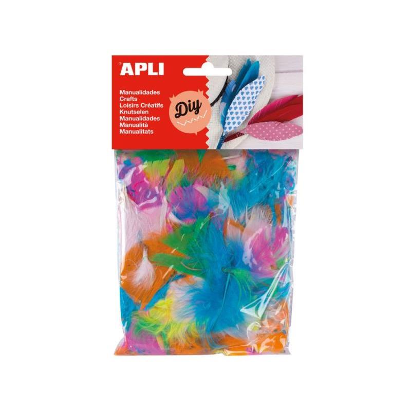 Plumas collage de colores surtidos: naranja, amarillo, azul, rosa, verde y blanco. Cada bolsa contiene 14 g de plumas. Producto básico para escuelas y talleres infantiles, ideales para crear collages, dar volumen a dibujos o usar en otras manualidades. Ideales para estimular la imaginación y creatividad de los niños.