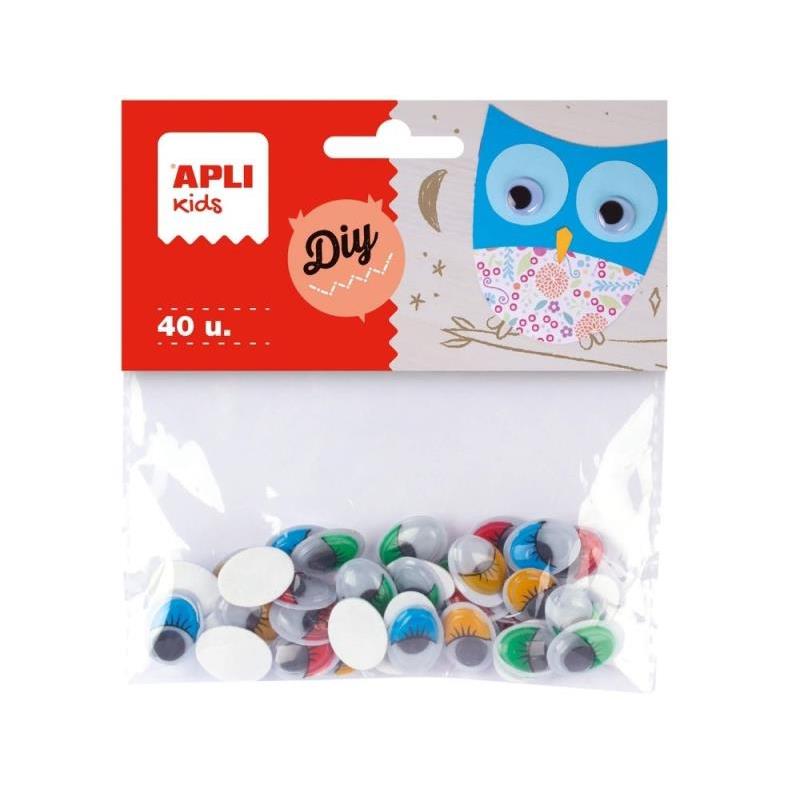 Ojos móviles adhesivos ovalados de colores surtidos: verde, azul, rojo y amarillo. Medida: 16 x 12 mm. Cada bolsa contiene 40 ojos. Ojos con adhesivo en el dorso, listos para usar. Gran poder de adhesión sobre multitud de superficies: papel, cartón, goma EVA, plástico, cerámica o cristal. Producto básico para escuelas y talleres infantiles, ideales para añadir a dibujos, marionetas o usar en otras manualidades.