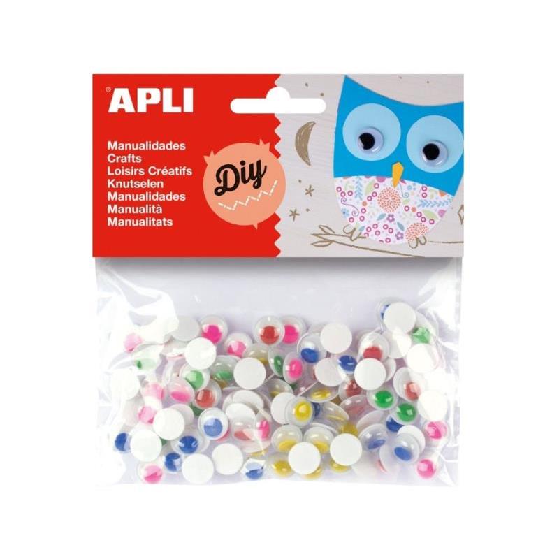 Ojos móviles adhesivos redondos con pupila de colores surtidos: verde, azul, rojo, amarillo y rosa. Medida: Ø 10 mm. Cada bolsa contiene 100 ojos. Ojos con adhesivo en el dorso, listos para usar. Gran poder de adhesión sobre multitud de superficies: papel, cartón, goma EVA, plástico, cerámica o cristal. Producto básico para escuelas y talleres infantiles, ideales para añadir a dibujos, marionetas o usar en otras manualidades.