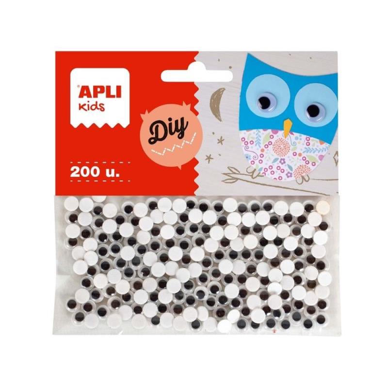Ojos móviles adhesivos redondos de color negro. Medida: Ø 6 mm. Cada bolsa contiene 200 ojos. Ojos con adhesivo en el dorso, listos para usar. Gran poder de adhesión sobre multitud de superficies: papel, cartón, goma EVA, plástico, cerámica o cristal. Producto básico para escuelas y talleres infantiles, ideales para añadir a dibujos, marionetas o usar en otras manualidades.