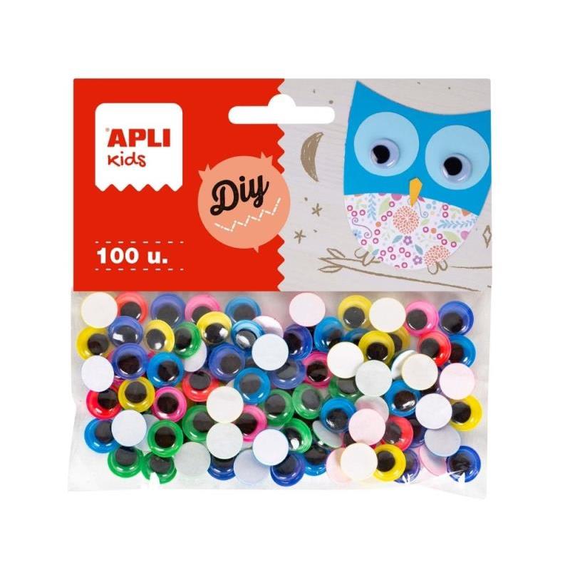 Ojos móviles adhesivos redondos de colores surtidos: rojo, amarillo, verde, azul y fucsia. Medida: Ø 10 mm. Cada bolsa contiene 100 ojos. Ojos con adhesivo en el dorso, listos para usar. Gran poder de adhesión sobre multitud de superficies: papel, cartón, goma EVA, plástico, cerámica o cristal. Producto básico para escuelas y talleres infantiles, ideales para añadir a dibujos, marionetas o usar en otras manualidades.