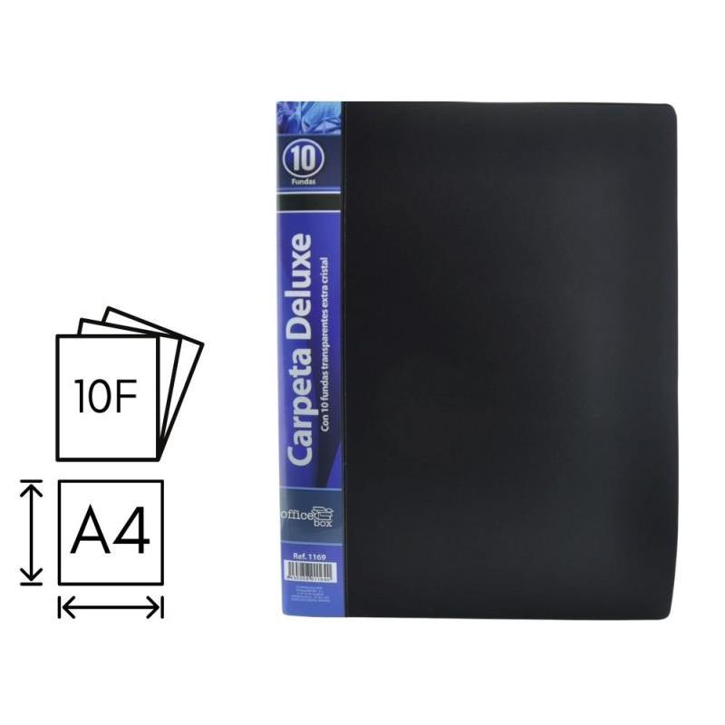 Material Duradero: Fabricada en polipropileno, ofreciendo resistencia al agua y polvo, protegiendo tus documentos de factores externos. Formato Estándar: Diseñada para documentos DIN A4, asegurando compatibilidad con el tamaño de papel más utilizado a nivel mundial. Almacenamiento Eficiente: Incluye 10 fundas transparentes soldadas al lomo, facilitando la organización y acceso rápido a tus documentos. Personalización a Tu Medida: Lomo y portada personalizables para una identificación rápida y sencilla, ideal para ambientes donde la organización es clave. Estética Profesional: Su color negro ofrece un aspecto elegante perfecto para oficinas y presentaciones formales. Función de Escaparate: La cubierta transparente permite exhibir la primera página o carátula, destacando el contenido sin necesidad de abrir la carpeta.