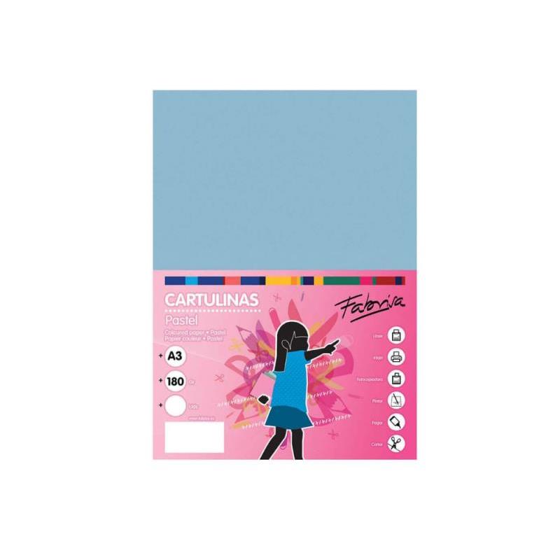 Cartulina azul claro de 180 g/m² tamaño A3. Cada pack contiene 50 cartulinas, tintadas en masa, ofreciendo así unos colores más homogéneos y nítidos. Ideal para su uso escolar, todo tipo de manualidades, cubiertas, separadores, impresión de documento, etc. Disponible en una amplia gama de colores.