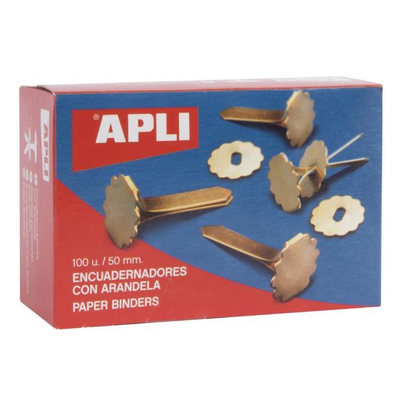Encuadernadores metálicos con arandela en color dorado de 50 mm. Cada caja contiene 100 encuadernadores. Aptos para todo tipo de documentos independientemente del número o distancia de sus perforaciones. Incluyen una arandela para colocar al final del documento para embellecer y evitar rozaduras del encuadernador en el papel. Ideales para encuadernar, sujetar o agrupar trabajos y apuntes, así como para usar en tus manualidades de Scrapbooking.