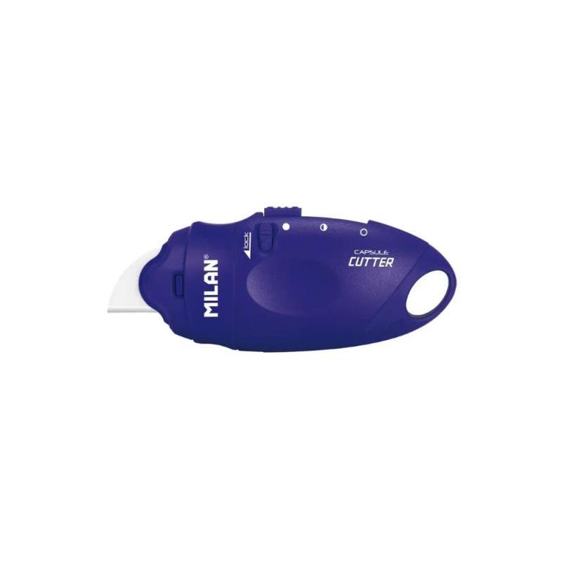 Cúter con hoja de cerámica reemplazable. Diseño CAPSULE serie Acid, color azul. Con sistema de bloqueo de seguridad y un botón deslizador. De pequeño tamaño, tipo de bolsillo. Con su forma ergonómica, es perfecto para hacer manualidades en casa o abrir paquetes en la oficina o almacén. La hoja cerámica corta distintos tipos de material. Dispone de un ojal para poder ser colgado. Hojas cerámicas de recambio disponibles