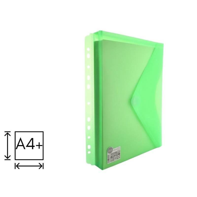 Material de alta resistencia: Hecha de polipropileno, asegura una protección robusta contra humedad, polvo y otros agentes externos. Sistema de cierre seguro: Su broche V-Lock garantiza que tus documentos permanezcan seguros y ordenados dentro de la carpeta. Compatibilidad universal: Gracias a sus perforaciones múltiples, puedes integrarla con diferentes tipos de archivadores y carpetas de anillas. Capacidad ampliada: El diseño con fuelle permite almacenar hasta 200 hojas, ideal para quienes manejan un gran volumen de papelería. Tamaño adecuado: Con medidas DIN A4+, ofrece un espacio ligeramente mayor que un A4 estándar, ideal para documentos protegidos con fundas plásticas. Organización cromática: El color verde es perfecto para categorizar documentos, facilitando el acceso rápido y eficiente a la información.
