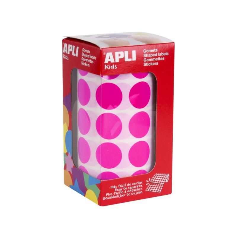 Rollo de gomets redondos de tamaño Ø 20 mm en color fucsia con adhesivo permanente. Cada rollo contiene 59 hojas pretroqueladas para una fácil separación, un total de 1.770 gomets por rollo.