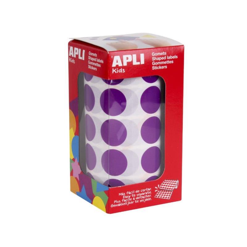 Rollo de gomets redondos de tamaño Ø 20 mm en color lila con adhesivo permanente. Cada rollo contiene 59 hojas pretroqueladas para una fácil separación, un total de 1.770 gomets por rollo.