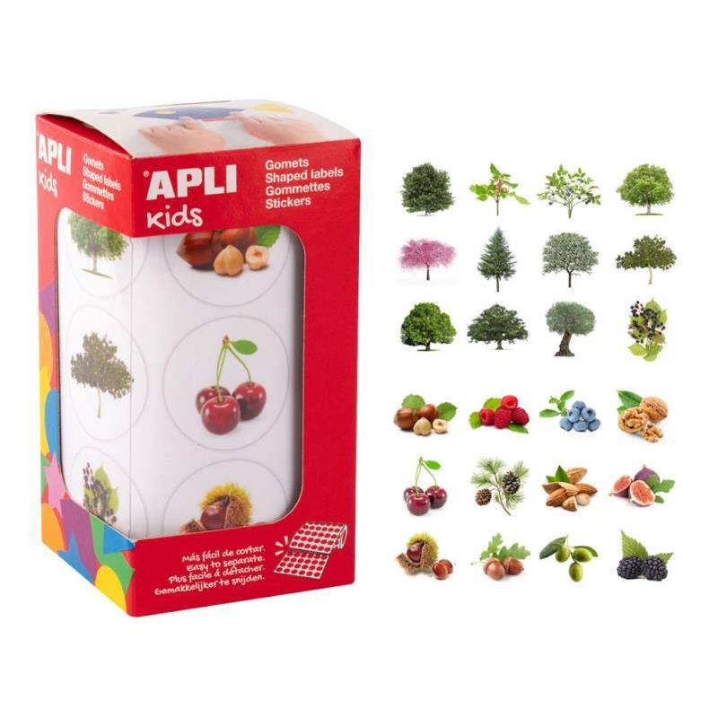 Rollo de gomets con temática árboles y sus frutos de tamaño 33 mm en formas surtidas y adhesivo permanente. Cada rollo contiene 30 hojas pretroqueladas para una fácil separación, con un total de 360 gomets en distintas formas: avellano, nogal, almendro, castaño, roble, higuera, cerezo, arándano, frambueso, abeto, olivo, morera, avellanas, nueces, almendras, castañas, bellotas, higos, cerezas, arándanos, frambuesas, piñas, olivas y moras. Además, incluye un folleto con la correspondencia entre árboles y frutos para poder identificar los gomets.