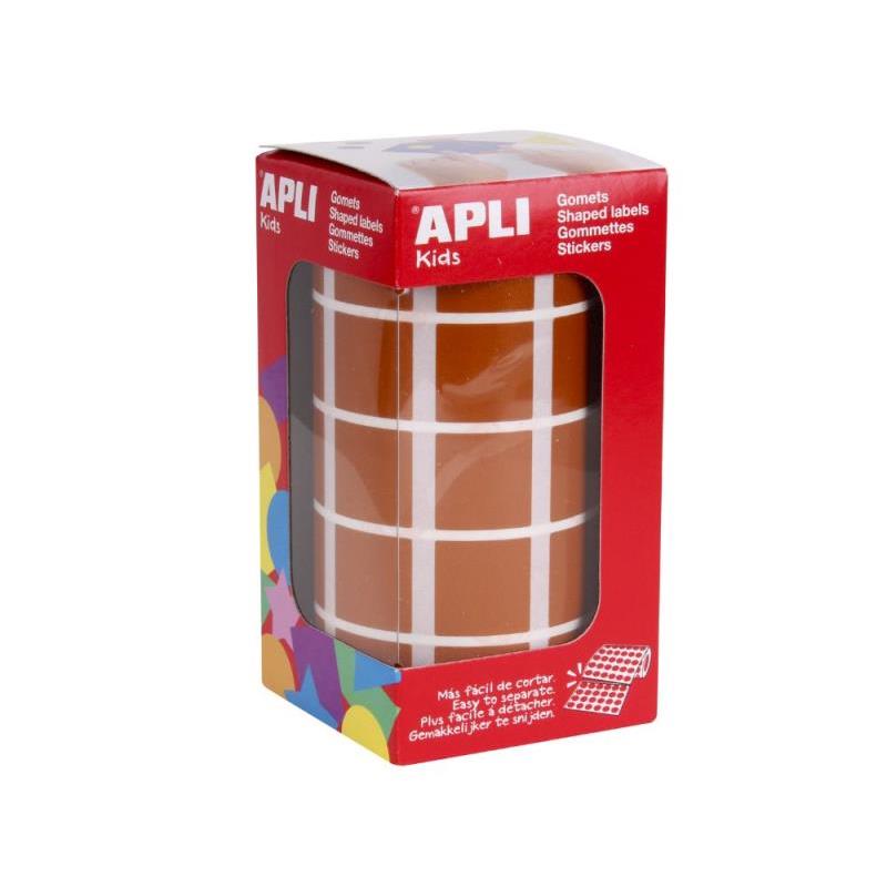 Rollo de gomets cuadrados de tamaño 20 x 20 mm en color marrón con adhesivo permanente. Cada rollo contiene 59 hojas pretroqueladas para una fácil separación, un total de 1.770 gomets por rollo.