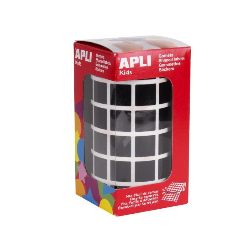 Rollo de gomets cuadrados de tamaño 15 x 15 mm en color negro con adhesivo permanente. Cada rollo contiene 59 hojas pretroqueladas para una fácil separación, un total de 2.832 gomets por rollo. El formato perfecto para usar en escuelas, guarderías, talleres infantiles o cualquier otro colectivo que trate con niños.