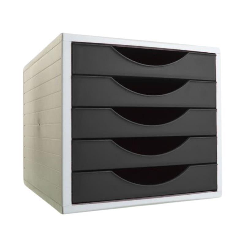 Diseño y Material: Fabricado con materias primas 100% recicladas y reciclables, este fichero destaca por su resistencia y durabilidad. Su acabado en negro opaco añade un toque de sofisticación a cualquier oficina. Dimensiones: Con medidas de 270 mm de ancho, 340 mm de profundidad y 260 mm de altura, el fichero es compacto y ahorra espacio en el escritorio. Capacidad y Organización: Equipado con cinco cajones espaciosos, cada uno con dimensiones interiores de 323 x 234 x 38 mm, permite almacenar documentos DIN A4, folios y subcarpetas de manera ordenada. Funcionalidad: Los cajones ofrecen un suave deslizamiento y cuentan con tope de seguridad. Además, su diseño apilable facilita una mayor capacidad de almacenamiento sin ocupar más espacio horizontal. Sostenibilidad: Certificado bajo la normativa europea EUCERPLAST, este producto refleja un compromiso con el medio ambiente al utilizar materiales reciclados.