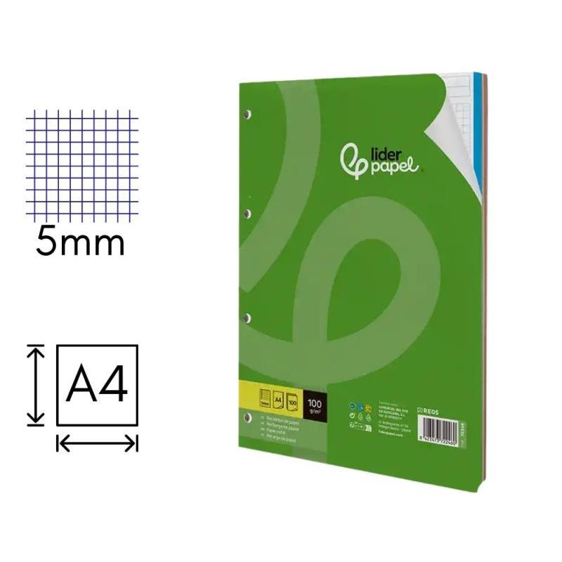 RECAMBIO LIDERPAPEL A4 100 HOJAS 100 GRS. CUADRO 5 MM. 4 TALADROS BANDAS DE 5 COLORES (72246)