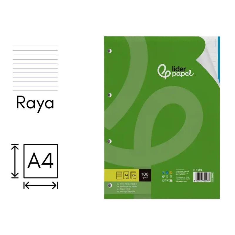 RECAMBIO LIDERPAPEL 100HOJAS 1 LINEA 100 GRS 4 ANILLAS BANDA 5 COLORES A4 LIDERPAPEL