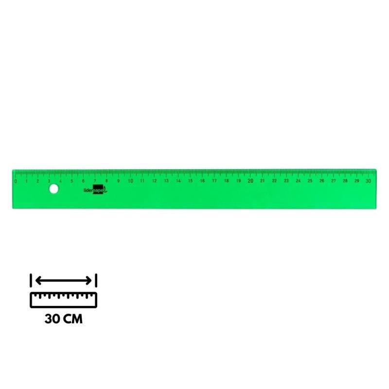 Material: Acrílico de alta calidad Longitud: 30 cm (300 mm) Color: Verde transparente Unidades de Medida: Centímetros y milímetros en uno de los bordes Cantos biselados a ambos lados Graduaciones grabadas a prueba de emborronamiento Resistente a golpes y caídas Fácil de limpiar y mantener Ideal para uso escolar, universitario y profesional