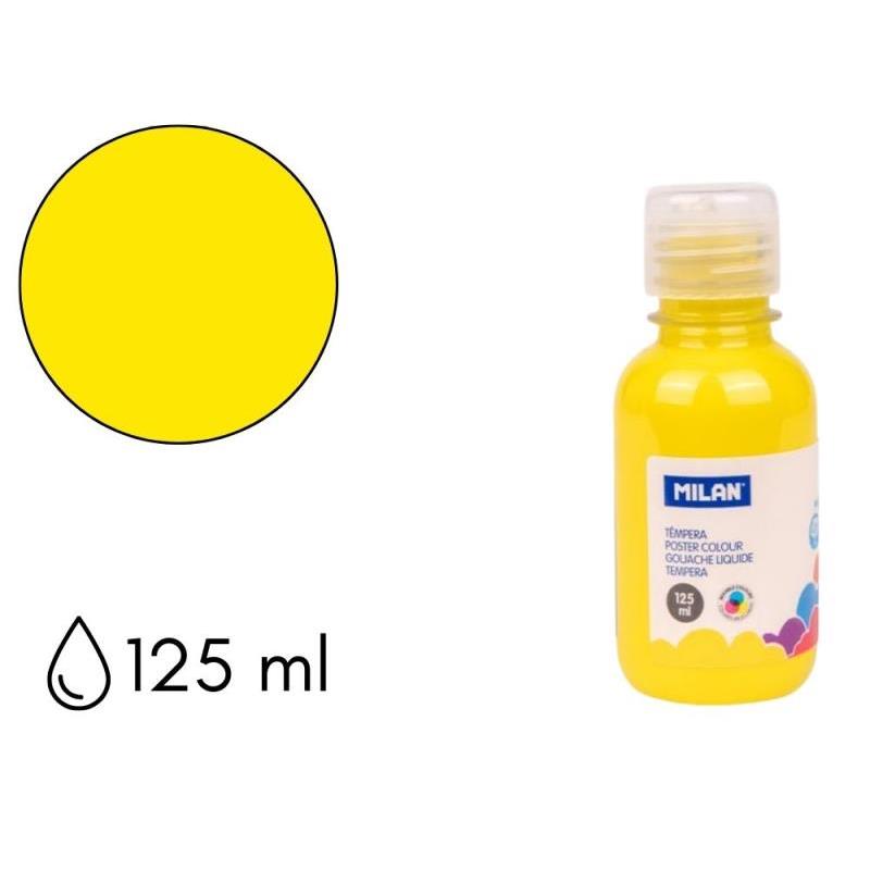 Botella de 125 ml con tapón dosificador, color amarillo. Témpera fabricada con pigmentos de calidad y resistentes a la luz. Los colores son vivosy puros gracias a su composición. Sus colores se pueden mezclar para crear nuevos tonos. La pintura tiene una viscosidad y poder cubriente excelentes. Está lista para usar y ofrece un óptimo rendimiento. Puede diluirse en agua para conseguir tonos más ligeros y un acabado acuoso. Se seca rápidamente.