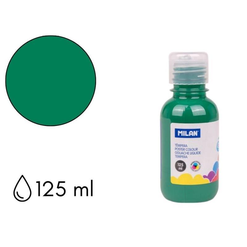 Botella de 125 ml con tapón dosificador, color verde oscuro. Témpera fabricada con pigmentos de calidad y resistentes a la luz. Los colores son vivos y puros gracias a su composición. Sus colores se pueden mezclar para crear nuevos tonos. La pintura tiene una viscosidad y poder cubriente excelentes. Está lista para usar y ofrece un óptimo rendimiento. Puede diluirse en agua para conseguir tonos más ligeros y un acabado acuoso. Se seca rápidamente.