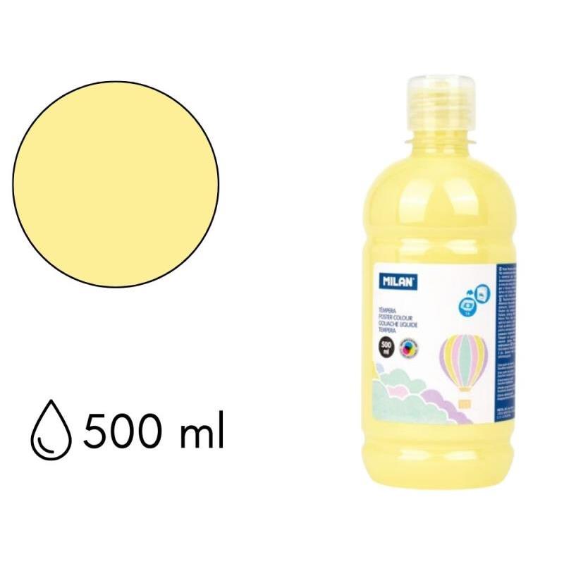 Botella de 500 ml con tapón dosificador, color amarillo pastel. Témpera fabricada con pigmentos de calidad y resistentes a la luz. Los colores son vivos y puros gracias a su composición. Sus colores se pueden mezclar para crear nuevos tonos. La pintura tiene una viscosidad y poder cubriente excelentes. Está lista para usar y ofrece un óptimo rendimiento. Puede diluirse en agua para conseguir tonos más ligeros y un acabado acuoso. Se seca rápidamente.
